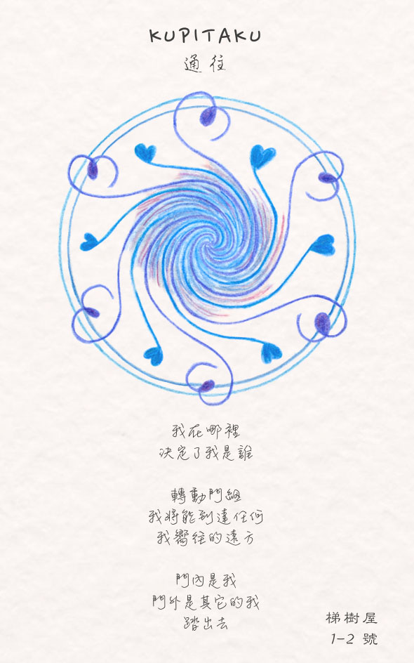 觀看右門扇KUPITAKU的曼陀羅畫及詩句後,向內心發問:「哪些方面可以開放地接受更多可能?」然後盲抽一張《內在森林》植物詩畫卡,置放於右門扇的右上方。